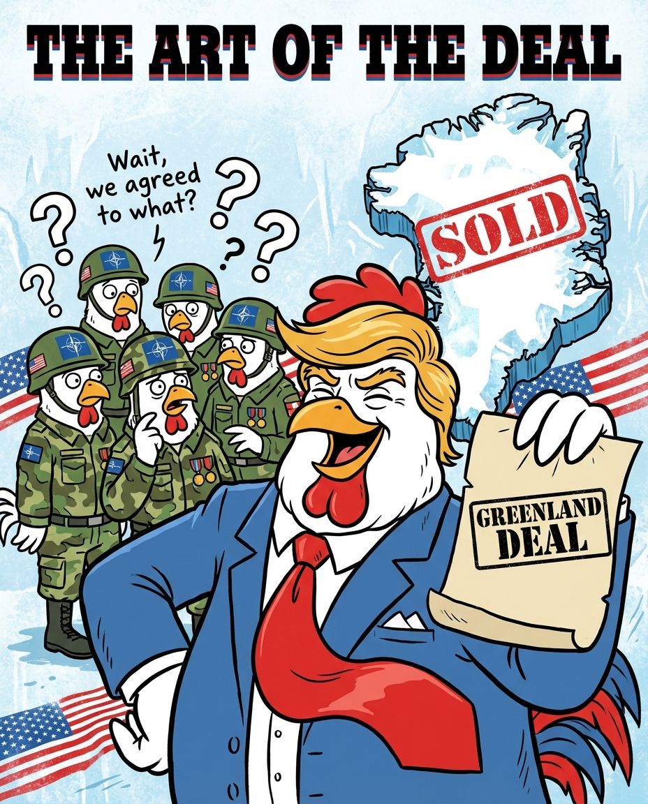 In a stunning development that surprised absolutely everyone (including, apparently, NATO), a certain golden-combed rooster has announced that a framework deal for Greenland is in place. The document, held triumphantly aloft, reportedly contains the words "Trust me" in very large letters.