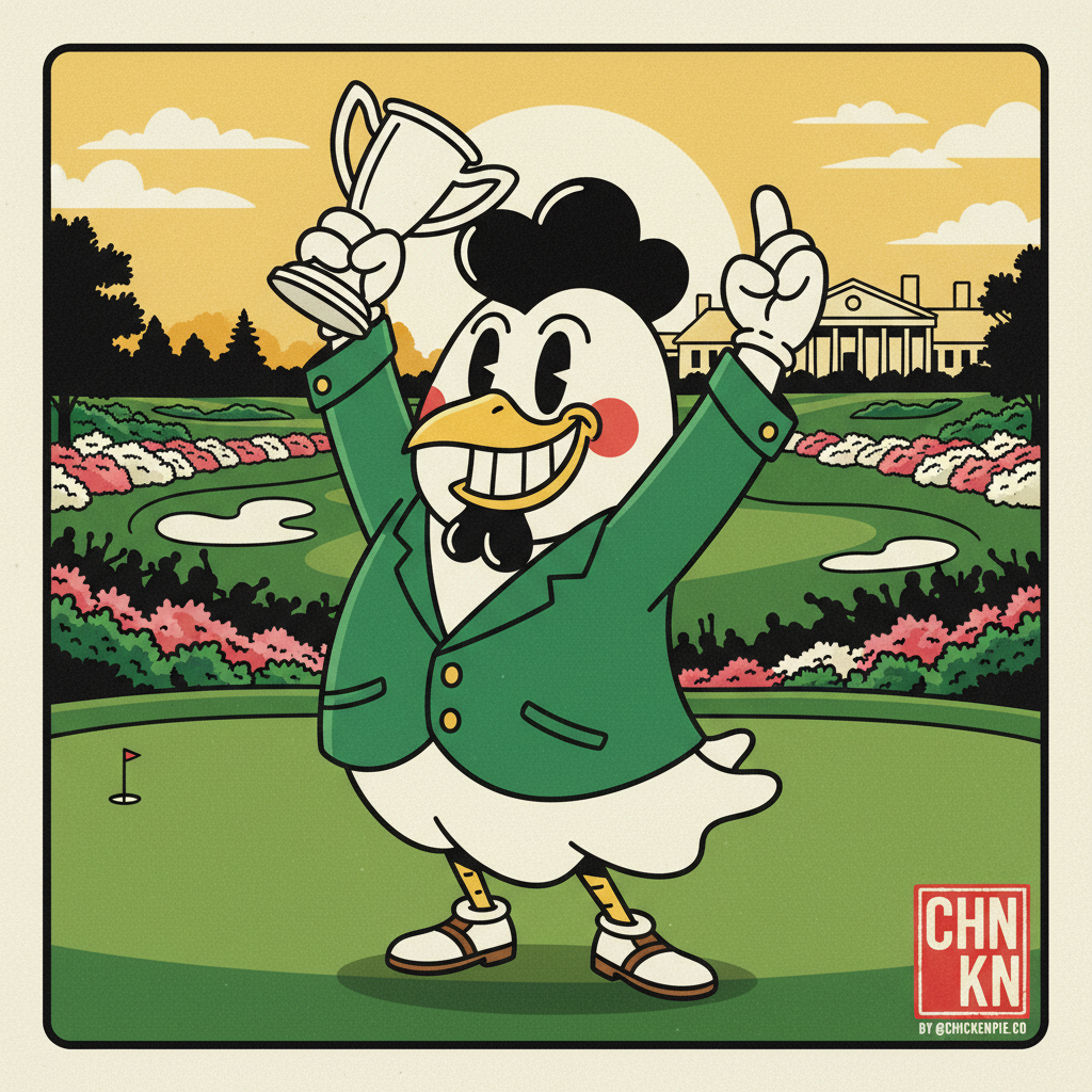 The real genius of The Masters isn't just the tournament — it's the tradition, the pageantry, the spectacle. And what better spectacle than a chicken in two-tone golf shoes standing on the 18th green, trophy overhead, living proof that sometimes the most absurd dreams are worth chasing?