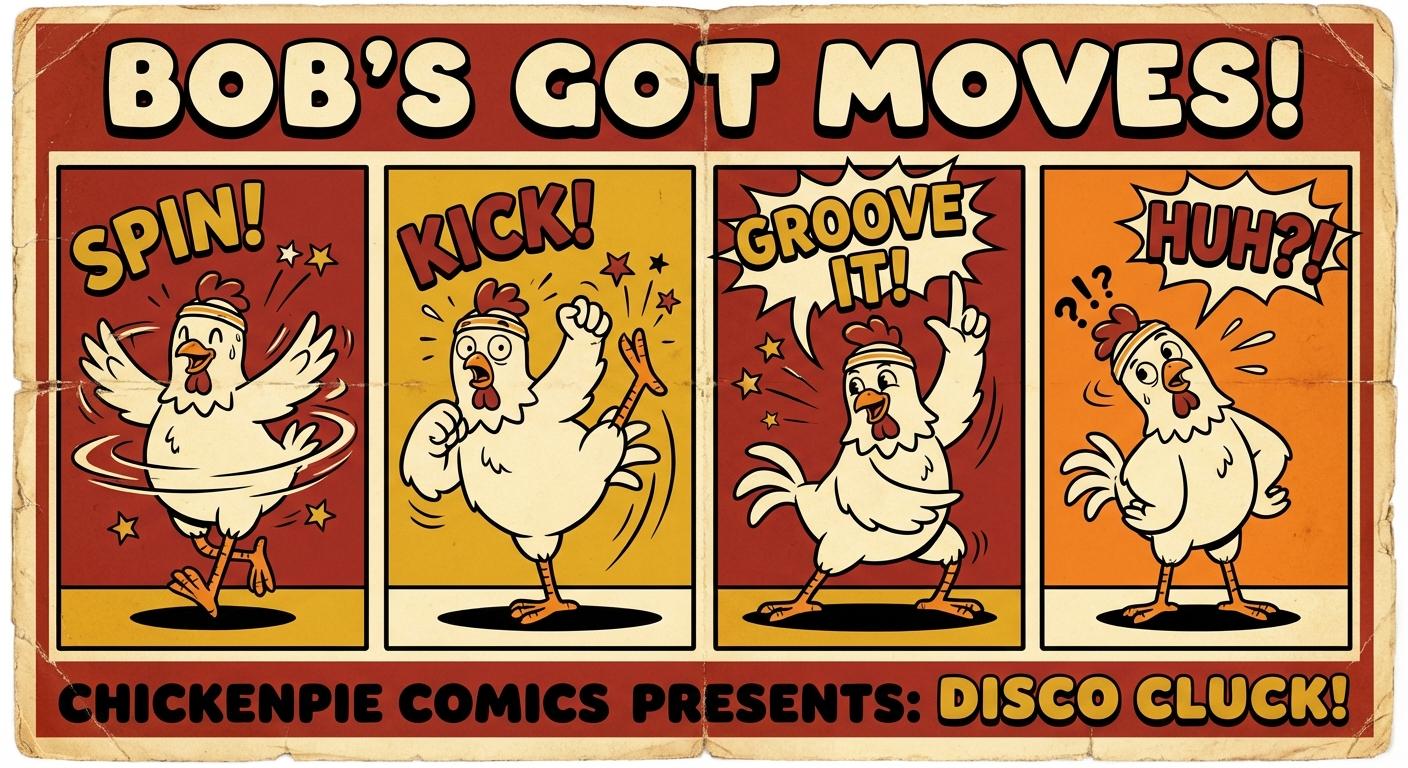 Watch him spin. Watch the confused bop. Watch the leg kick that defies poultry physics. This is what happens when a chicken discovers rhythm—awkward, hilarious, absolutely committed.