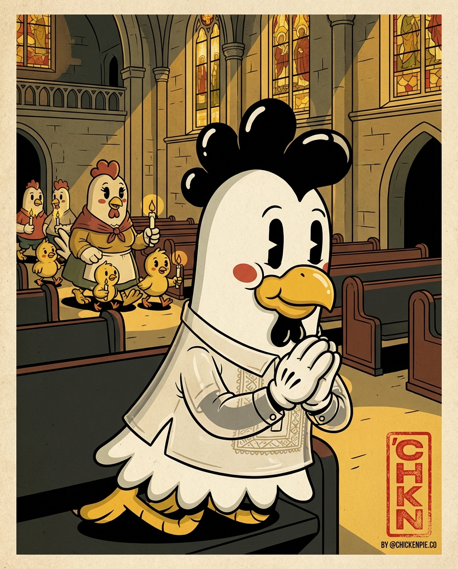 So naturally, our eternally chaotic Chester needed to stop for a moment. Here he is—kneeling in his finest barong tagalog, rubber-hose arms clasped in prayer, surrounded by the warm glow of Easter candles. Henrietta and the chicks hold their own candles behind him, creating a gentle procession of light through the vintage church interior.