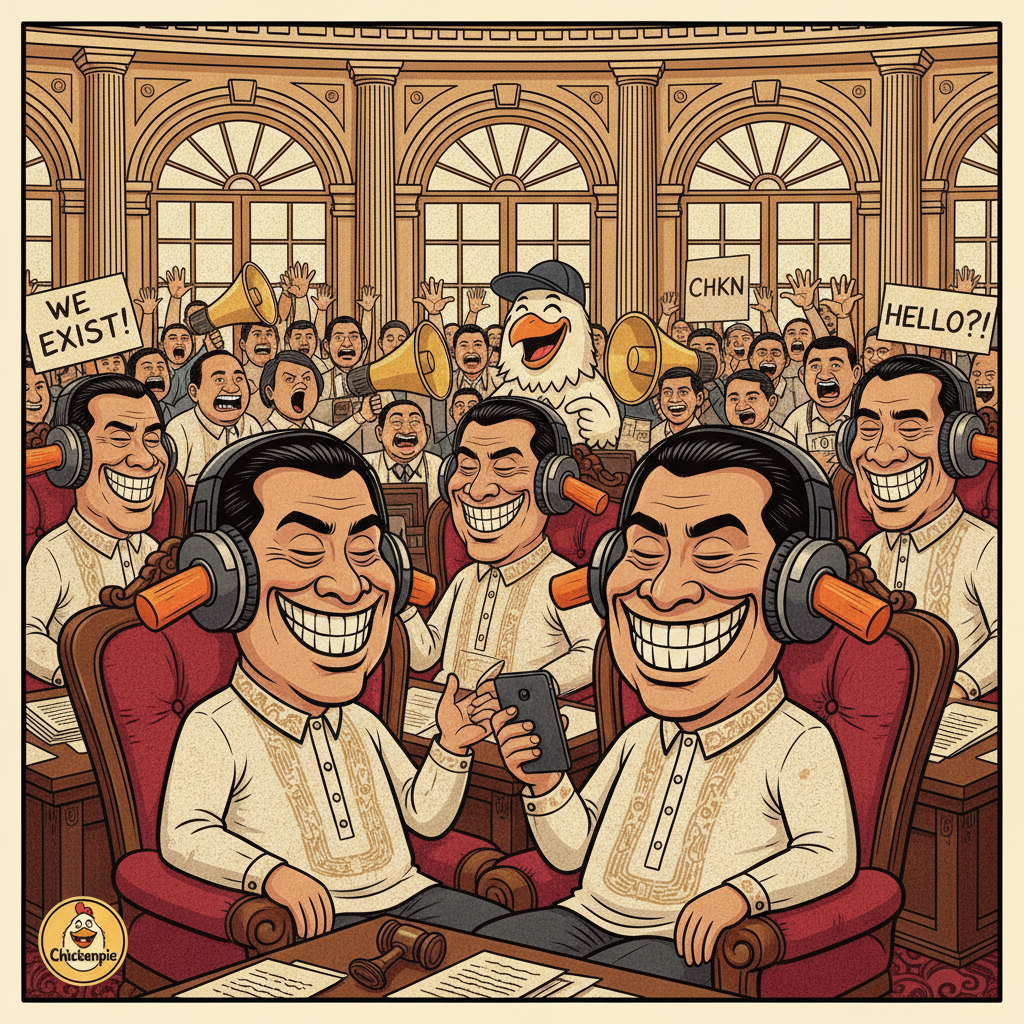 Picture the scene: rows of honorable representatives seated in plush Congress chairs, eyes serenely closed, wearing the finest noise-canceling headphones money from the public fund can buy. Outside the tinted windows, the Filipino people — armed with megaphones and a collective sense of civic betrayal — are screaming into the void. Our CHKN mascot is there too, holding a sign that says 'CLUCK YOUR EARS OPEN.' Nobody inside can hear a thing. And honestly? They prefer it that way.