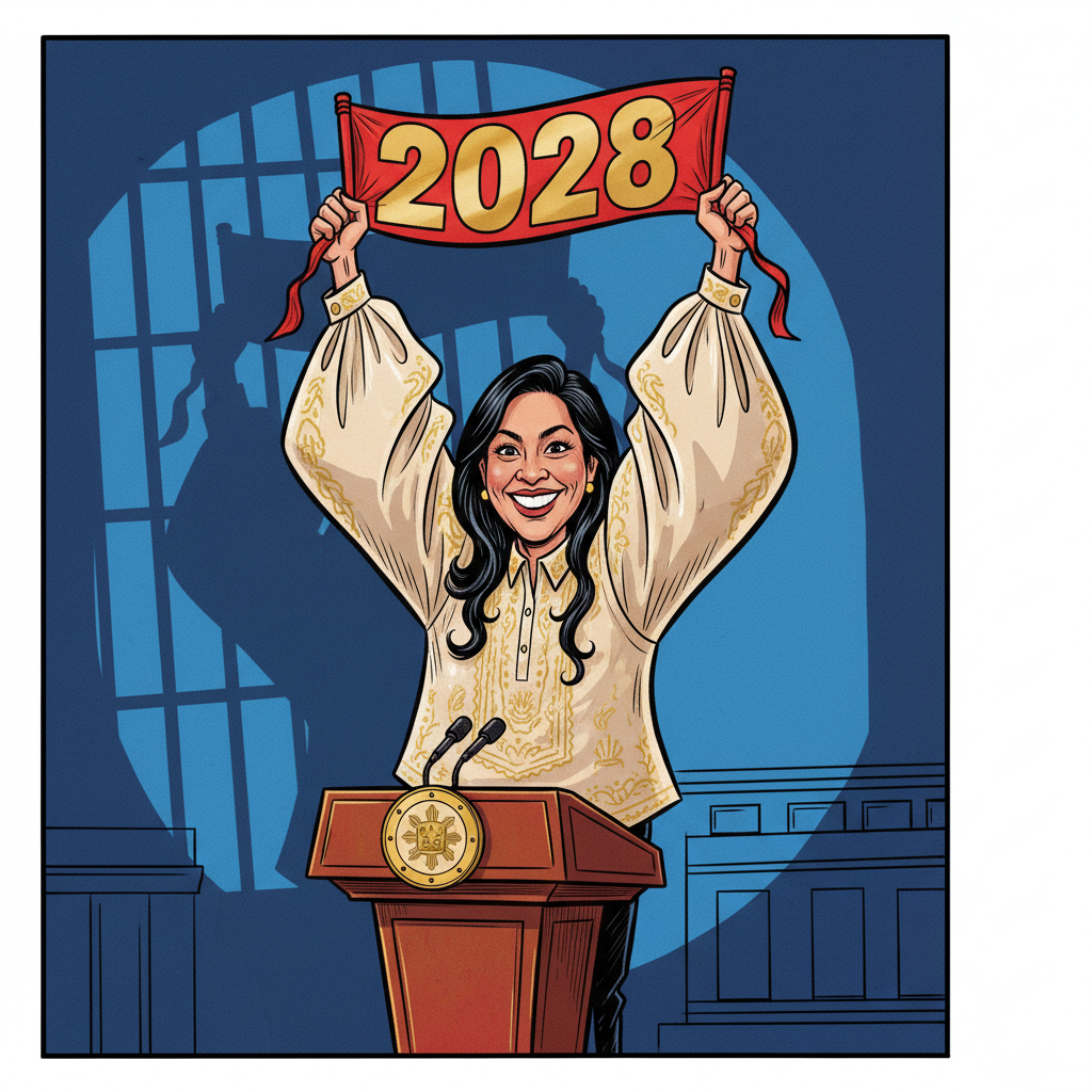 There is something uniquely Filipino about this political moment: a sitting vice president — currently facing multiple impeachment complaints for corruption — announcing a presidential bid while asking for 'forgiveness' from the same electorate she allegedly wronged. The caricature draws itself. Sara stands triumphant on the podium, arms wide, '2028' banner unfurled, while the shadow of prison bars looms theatrically behind her. Philippine politics is not merely drama; it is grand opera performed on a barangay stage.