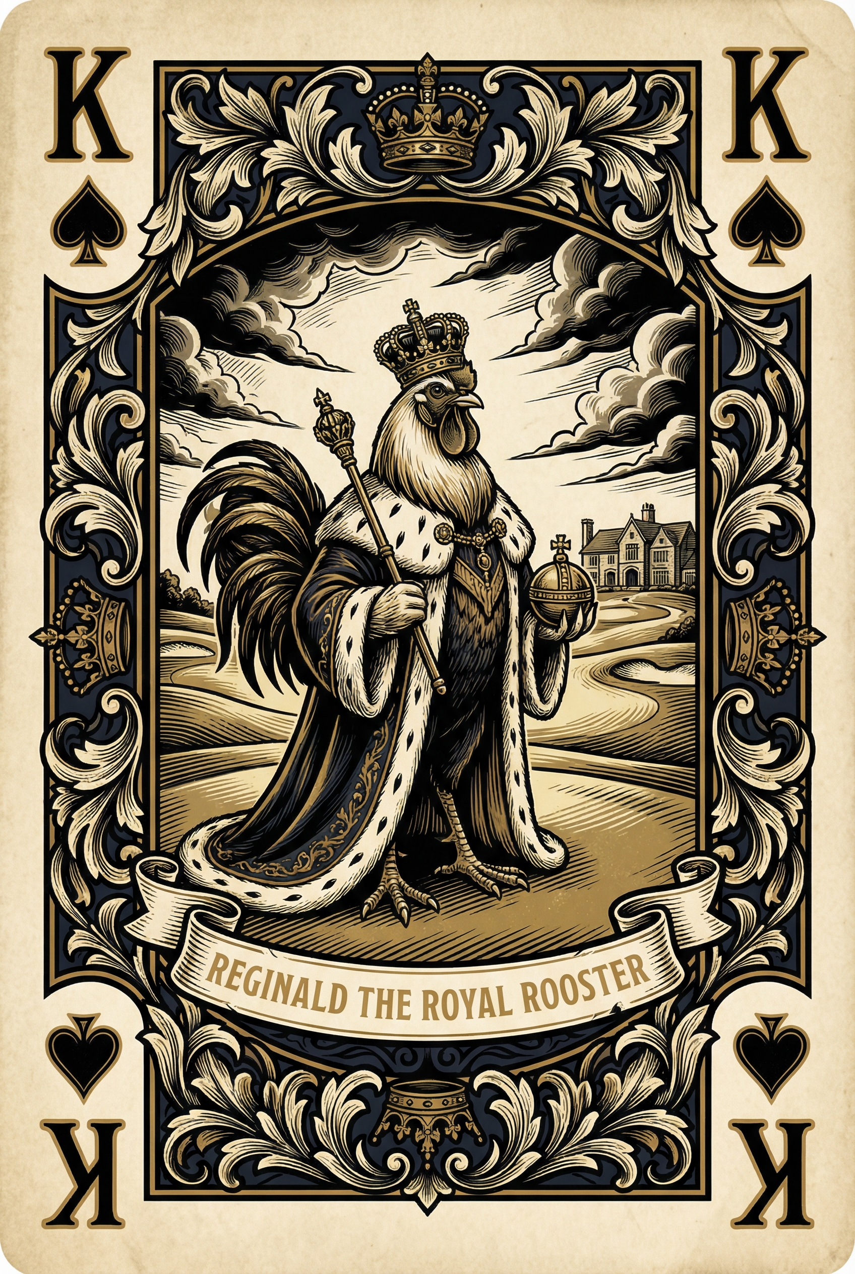 He doesn't just walk into a room — he commands it. Meet Reginald The Royal Rooster, the undisputed King of Spades in the Chickenpie Playing Card Deck.