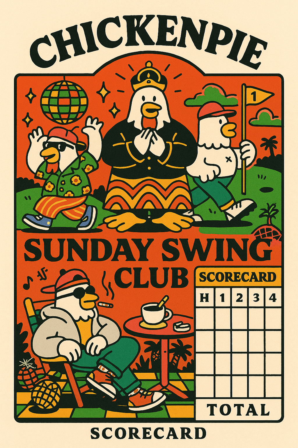 Sunday Swing Chicken discovered the place by accident, following an errant drive through a hedge that seemed, upon closer inspection, to be more doorway than shrubbery. Inside: the Emperor on a velvet settee, a disco chicken spinning impossible records, and a lounging philosopher who never gave his name.