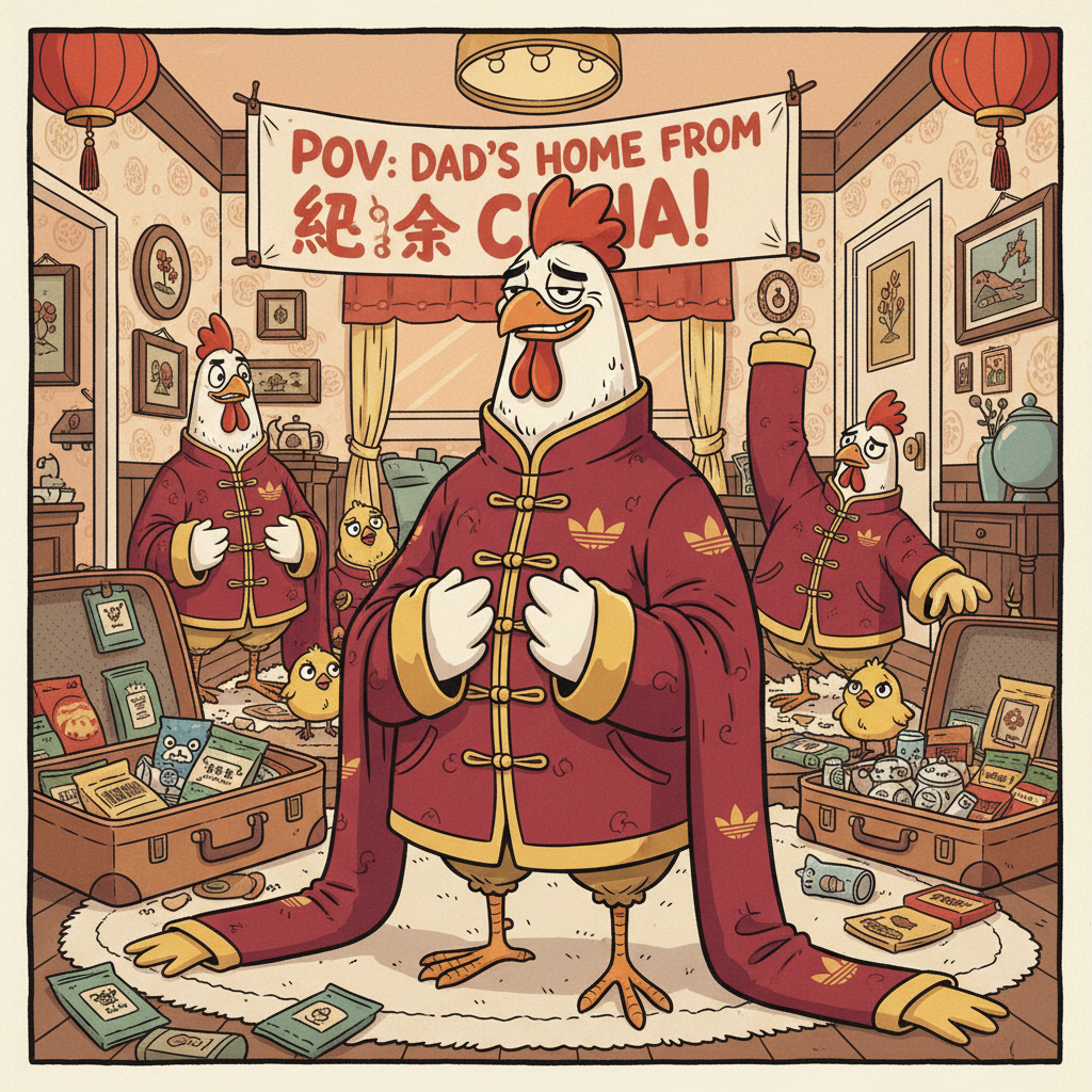 When Chester Cluck's dad returned from Shanghai with a burgundy suitcase full of Adidas Tang jackets, the coop erupted into chaos. The oversized jackets—complete with traditional frog buttons and Mandarin collars—became instant family uniforms, sleeves dragging on the ground as everyone strutted around like they'd just discovered their roots in a carry-on bag.