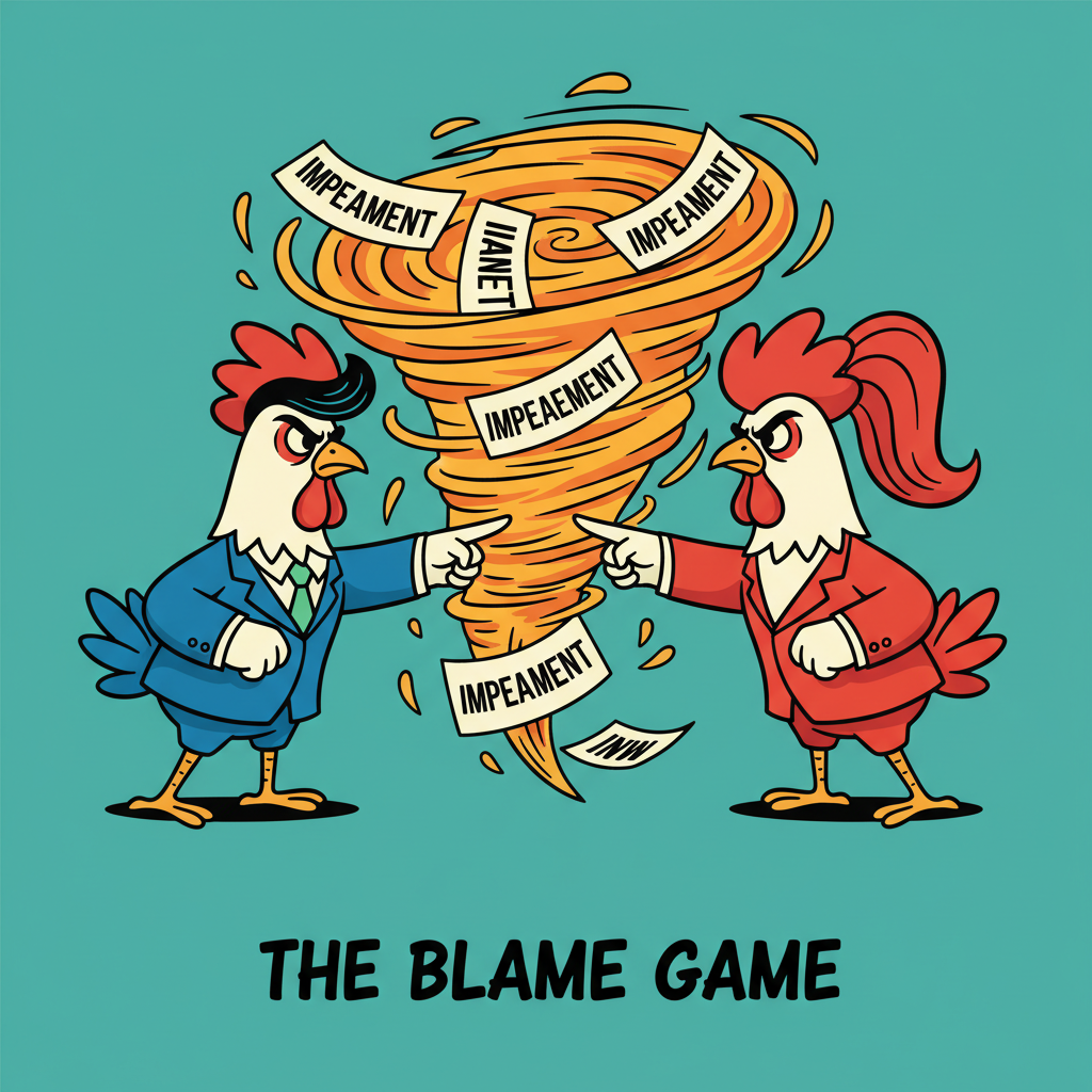 This satirical piece captures the ongoing political drama as both President Marcos and Vice President Duterte face mutual impeachment complaints - a true Philippine political showdown.